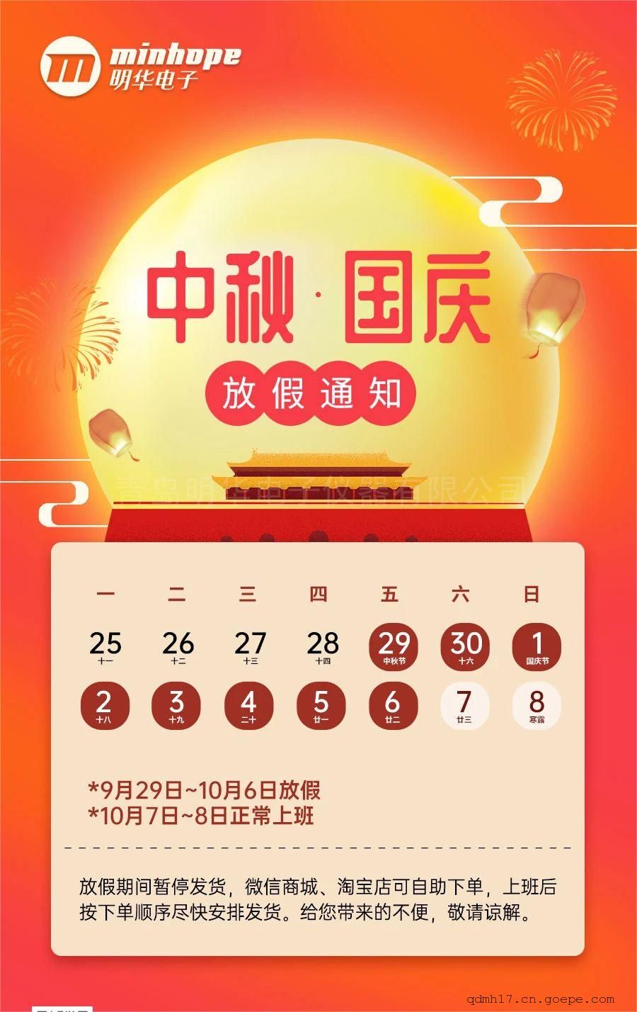 2023年9月27日,青岛明华电子官方公众号发布“中秋国庆双节放假通知”一文,请注意自身安全和财产安全,遵守国家法规,祝大家度过一个愉快的假期。