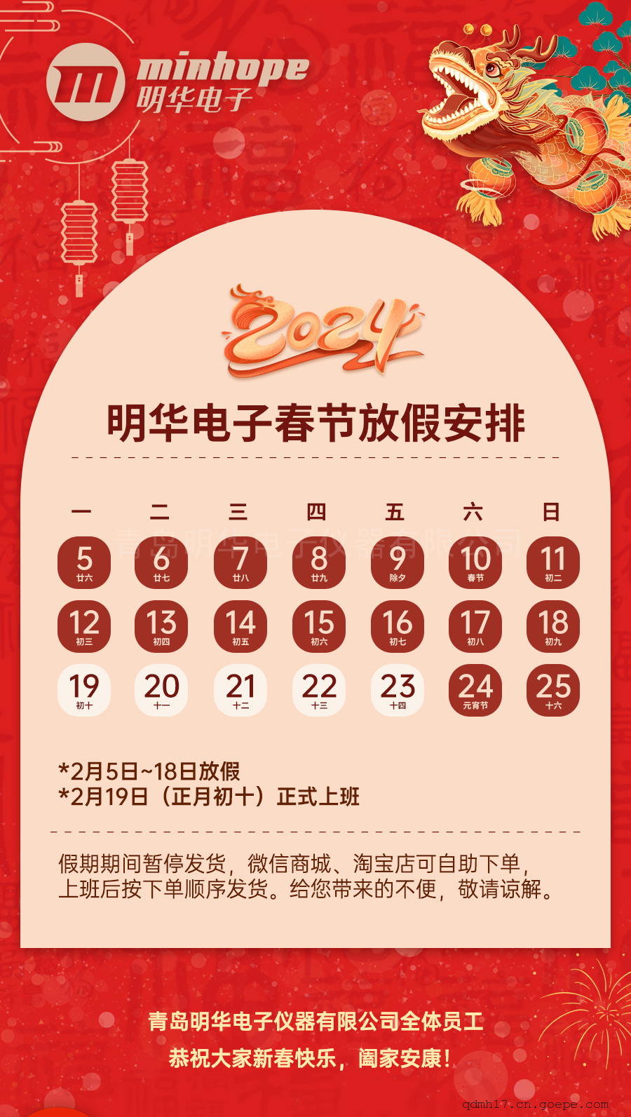 - 公司动态明华电子春节放假通知2024-02-05 21:02:40 来源:青岛明华电子仪器有限公司 2024年2月4日,明华电子官方公众号发布“ 明华电子春节放假通知”一文。