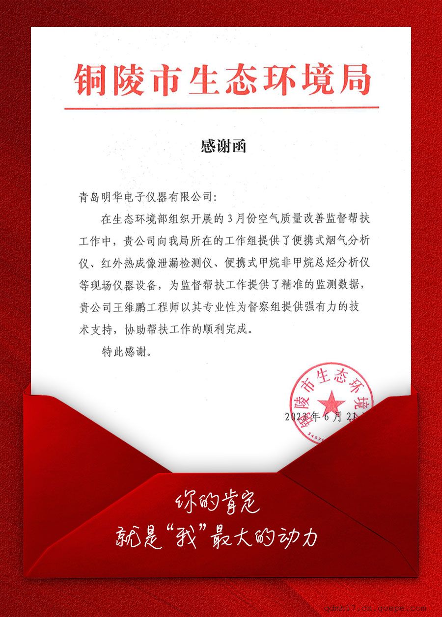 感谢函中充分肯定了明华电子便携式烟气分析仪(MH3200)、红外热成像泄漏检测仪(MH3560)、便携式甲烷非甲烷总烃分析仪(MH3500-C)等仪器为监督帮扶工作中提供的精准数据,同时也赞扬了明华售后工程师王维鹏的娴熟技能,特发此函以示感谢!