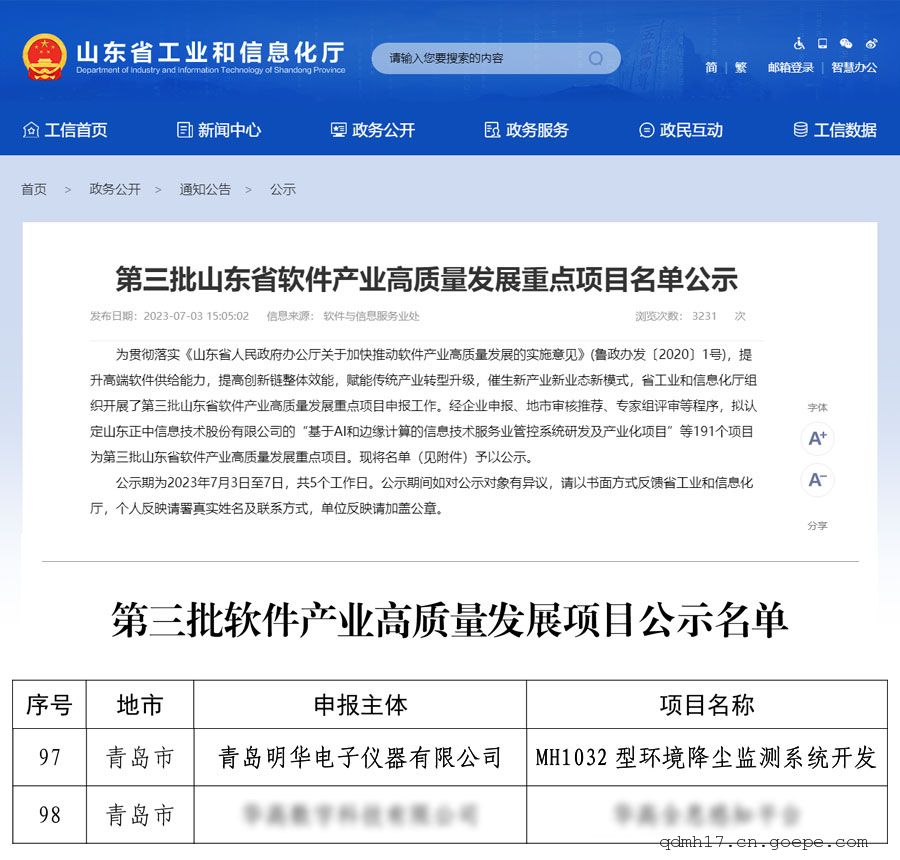 近日,山东省工业和信息化厅公布《第三批山东省软件产业高质量发展重点项目名单公示》,明华电子成功入选。