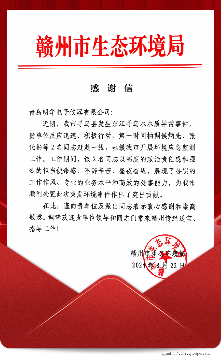 近日,青岛明华电子仪器有限公司收到来自赣州市生态环境局的感谢信,对我司在应对东江寻乌水水质异常事件中的迅速响应和积极支援表示高度认可。