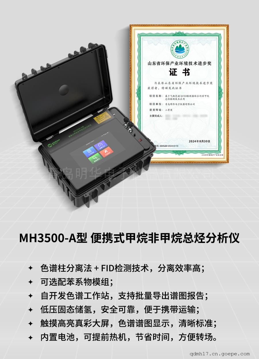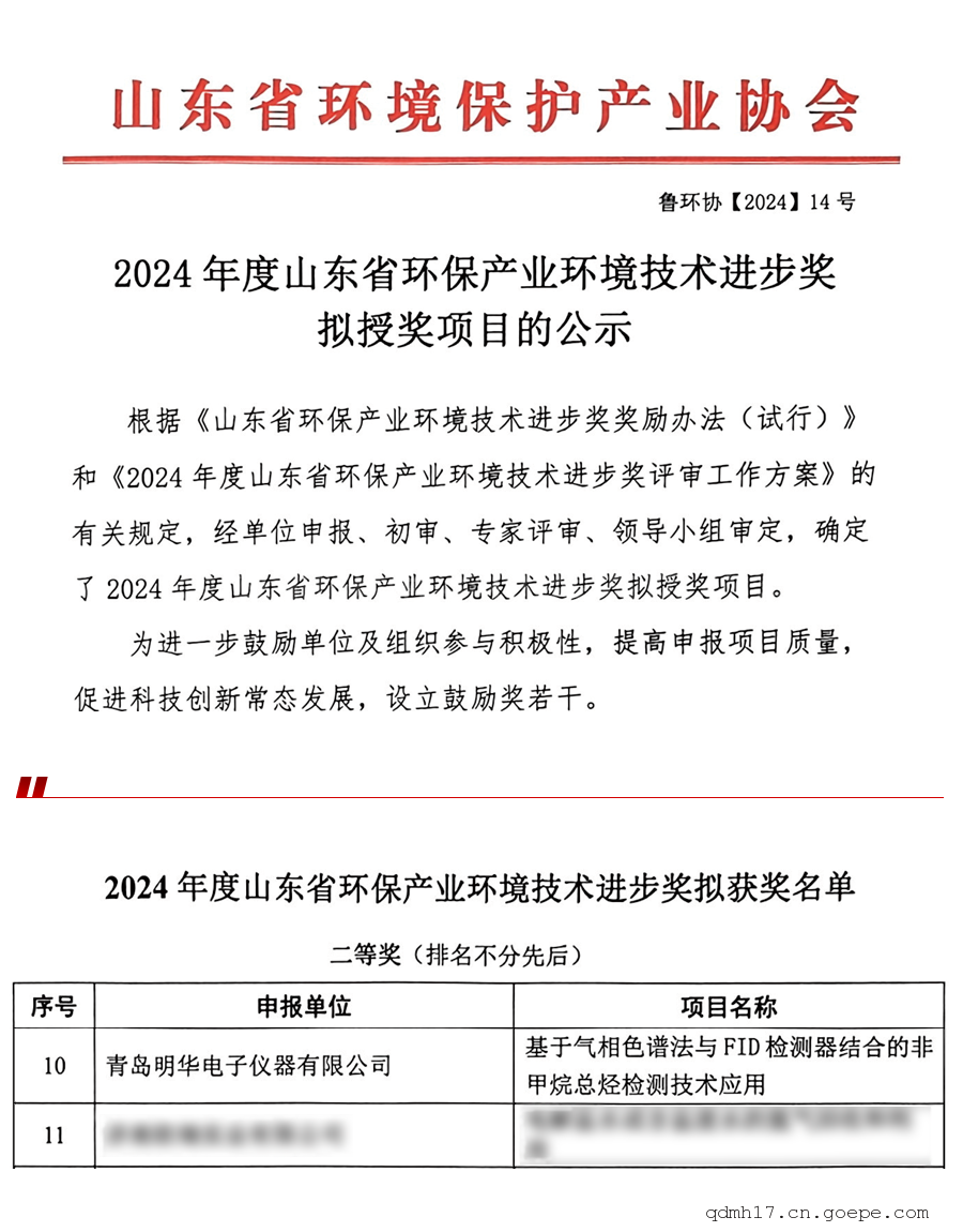 在推动生态文明建设、促进绿色发展的征途中,科技创新始终是不可或缺的驱动力。近日,2024年度山东省环保产业环境技术进步奖获奖项目名单公布,明华电子仪器有限公司凭借“基于气相色谱法与FID检测器结合的非甲烷总烃检测技术应用”在众多参评项目中脱颖而出,荣获2024年度山东省环保产业环境技术进步二等奖。