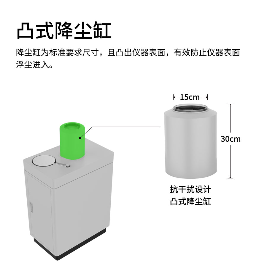降尘缸为标准要求尺寸,且凸出仪器表面,有效防止灰尘进入;
