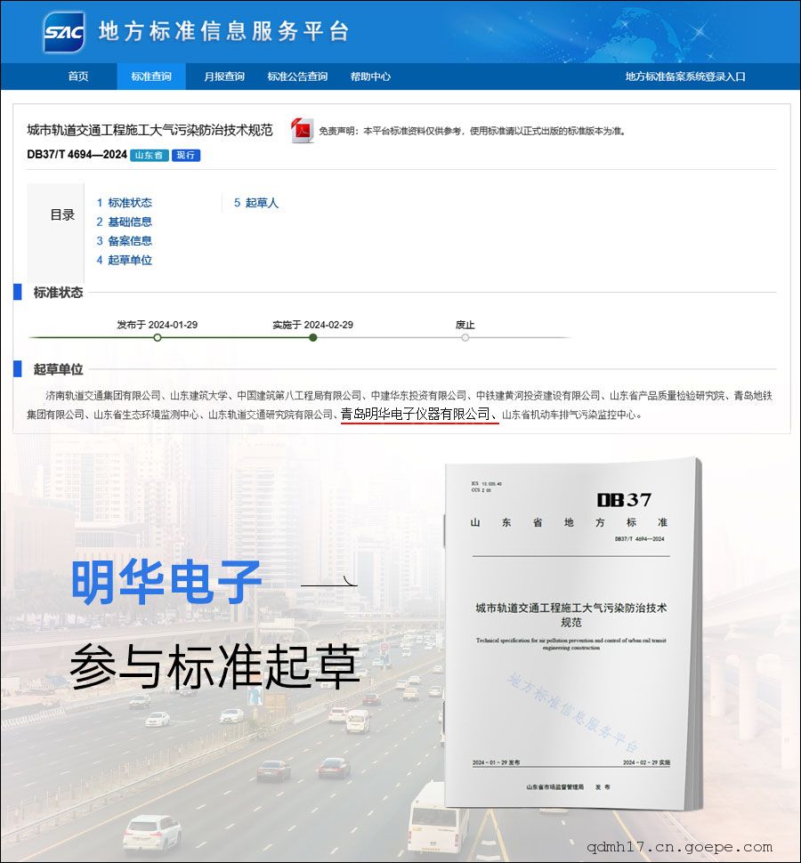 近日,山东省轨道交通领域S个生态环保地方标准DB37/T 4694-2024《城市轨道交通工程施工大气污染防治技术规范》已正式实施,明华电子参与了该标准的起草工作,该标准规定了城市轨道交通工程施工扬尘、焊接烟尘、非道路移动机械排气和挥发性有机物污染防治的技术要求及相应的证实方法。