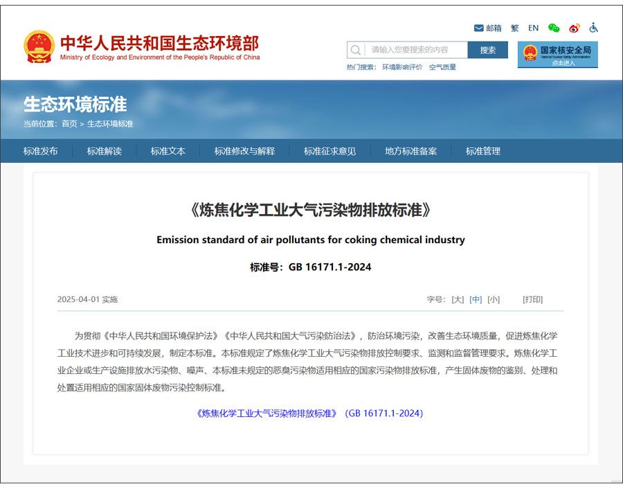 焦化生产过程中排放的大气污染物种类多,排放环节复杂,易发生“跑冒滴漏”等无组织排放问题。随着蓝天保卫战不断深入,2025年4月1日,《炼焦化学工业大气污染物排放标准》(GB 16171.1—2024)正式实施,替代2012版旧规,标志着焦化行业迈入更严格的环保治理阶段。焦化行业是重要基础原材料产业,也是大气污染防治重点行业,此次修订聚焦四大核心领域: